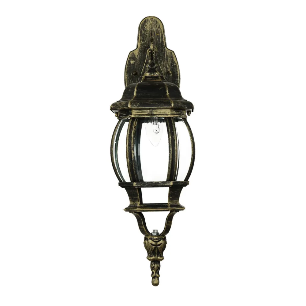Die rustikale Außenleuchte in Gold Antik besteht aus witterungsbeständigem Aluminium und robustem Glas