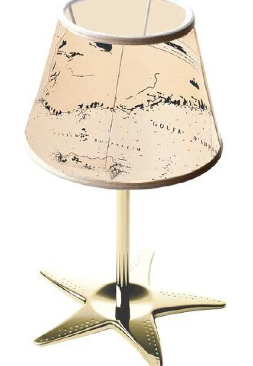 Für eine außergewöhnliche Ambientebeleuchtung sorgt der Schirm aus Pergament Papier, der den Ausschnitt einer antiken Seekarte darstellt.