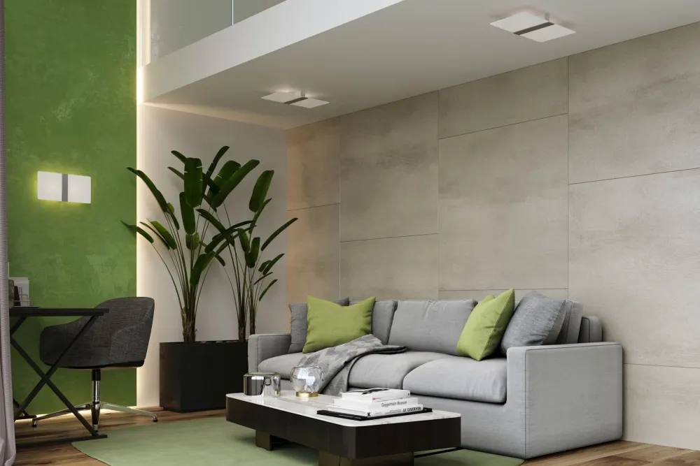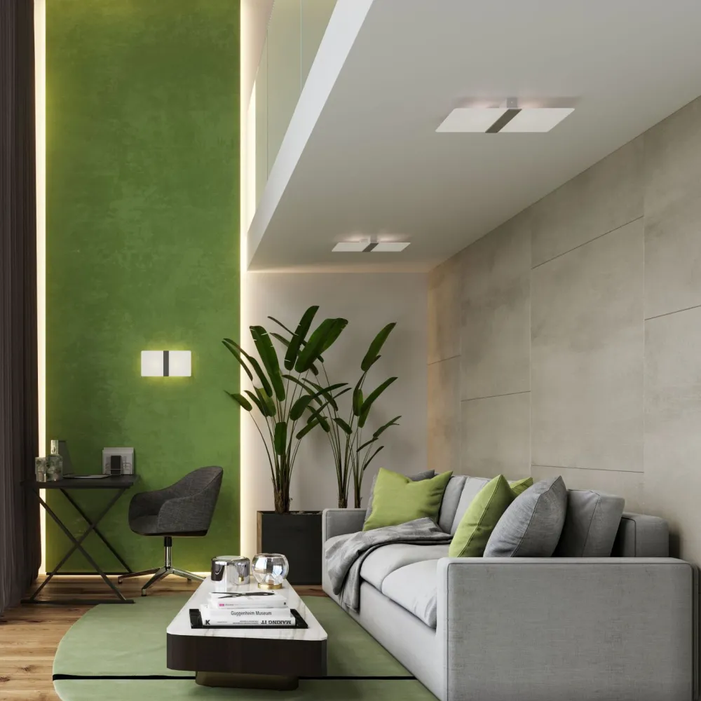 Das Licht wird blendarm gestreut, was eine angenehme und großzügige Beleuchtung in Wohnzimmer und Flur erlaubt