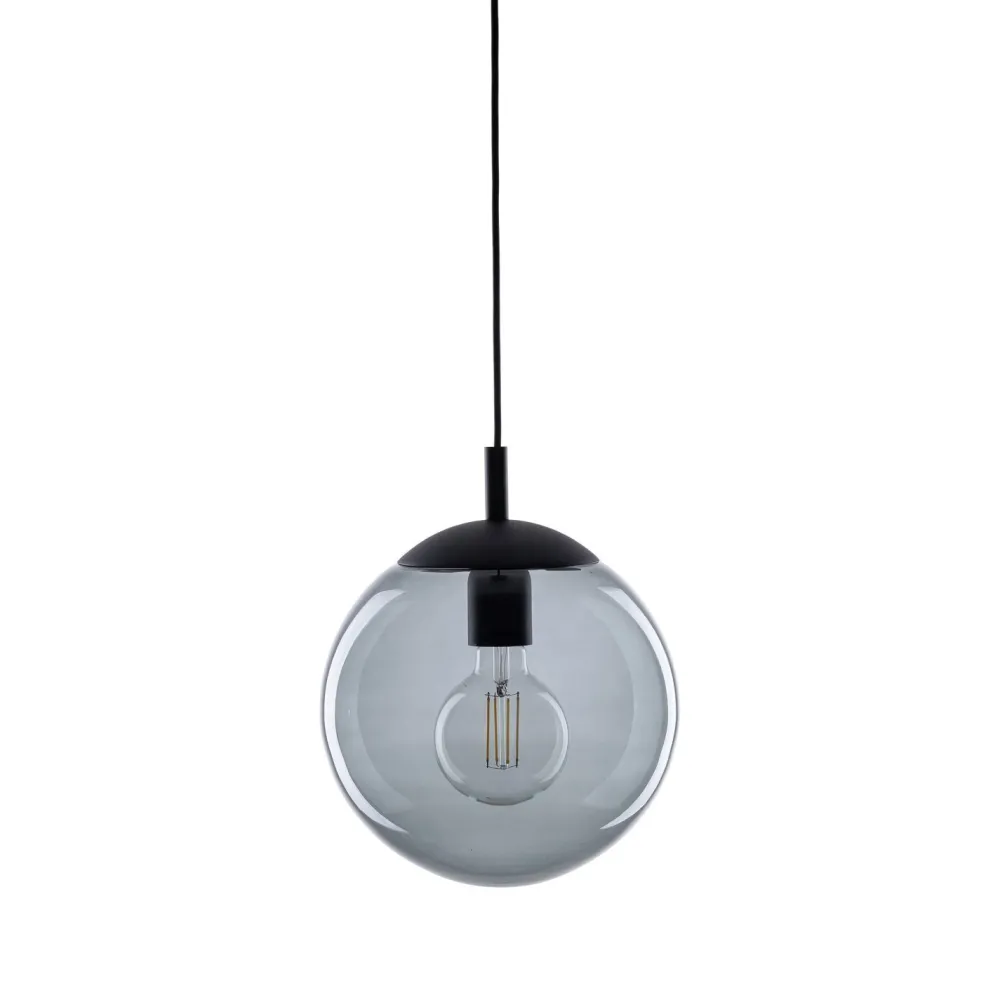 Schmale Pendelleuchte mit Kugelschirm aus Rauchglas