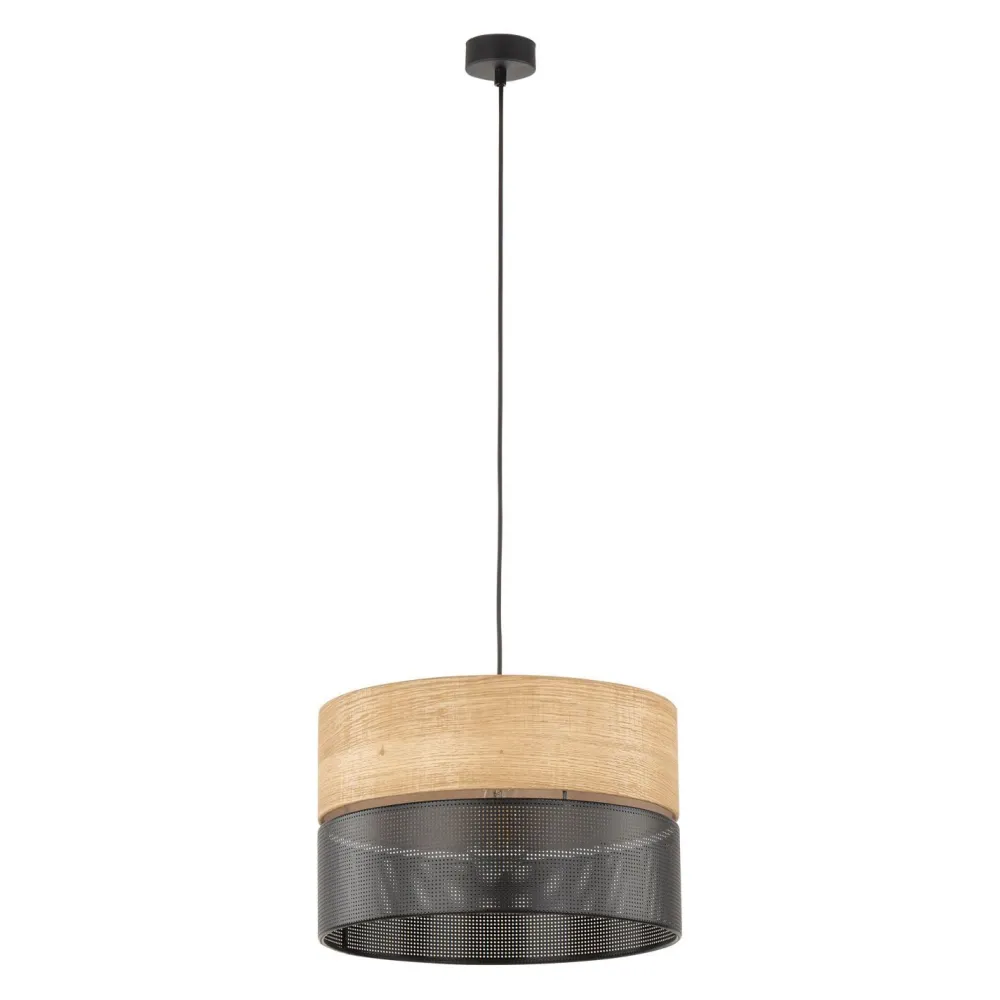 Der offene Schirm besticht durch seine Kombination aus Holzoptik und offenem Stoff, was für einen wohnlichen Look sorgt